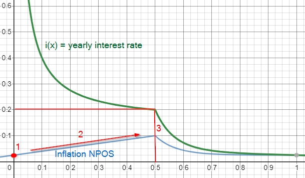 The second number shows a linear increase of inflation if the staking rate is between 0 and 50%. There is a linear correlation between the staking rate and inflation till 0.5 is reached. The inflation rate is 5% if the staking rate is at 25%. If the staking rate doubles to 50%, so does the inflation rate to 10%. But remember: It is only linear till 50% staking rate is reached.